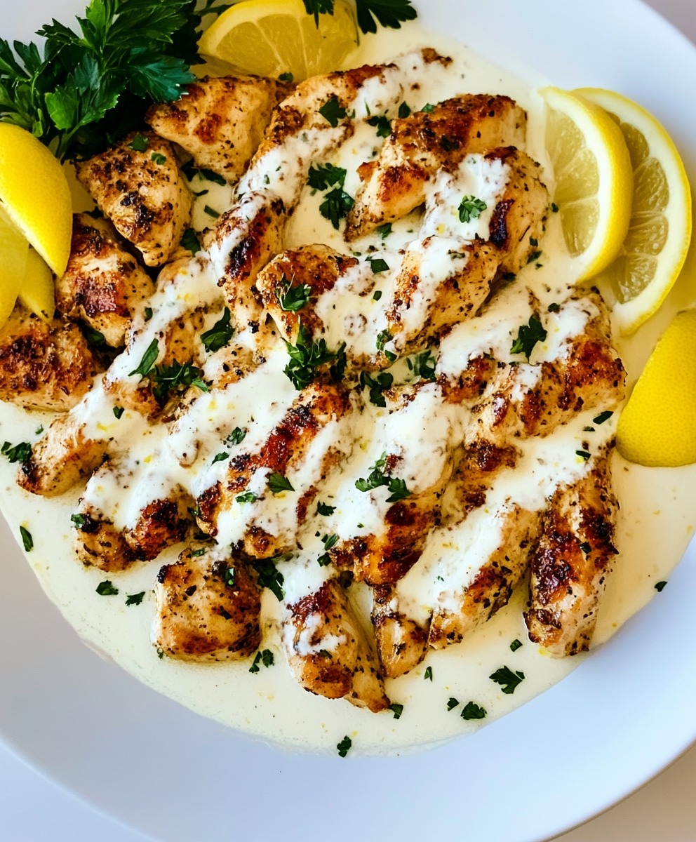 **🔥 Pikantny, pikantny sos cytrynowo-czosnkowy idealnie oblepia delikatnego marynowanego kurczaka — aromatyczne danie kuchni śródziemnomorskiej, łatwe w przygotowaniu i pełne smaku!**