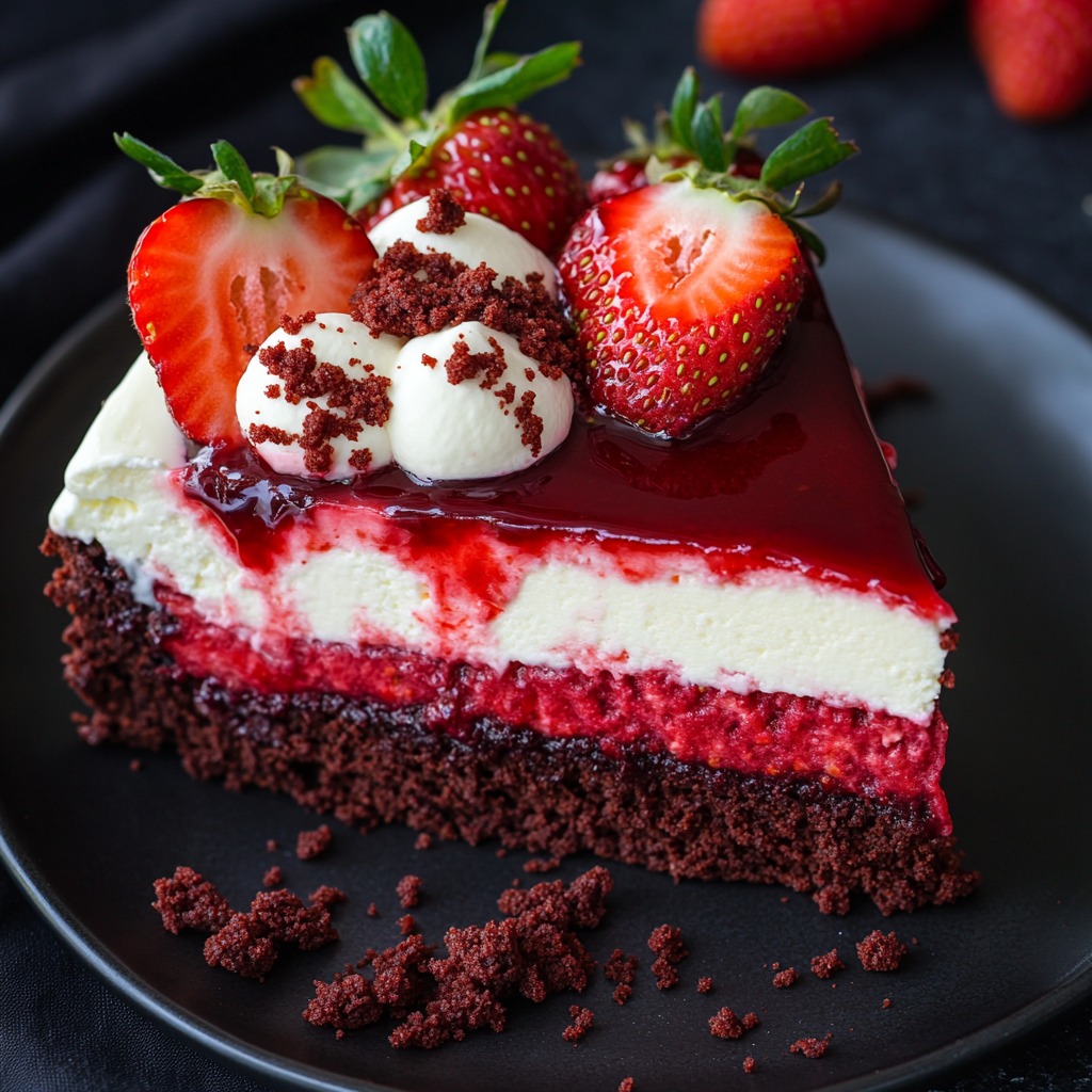 Wymarzone połączenie bogatego ciasta Red Velvet, kremowego sernika i świeżego sosu truskawkowego — idealny deser na każdą uroczystość!