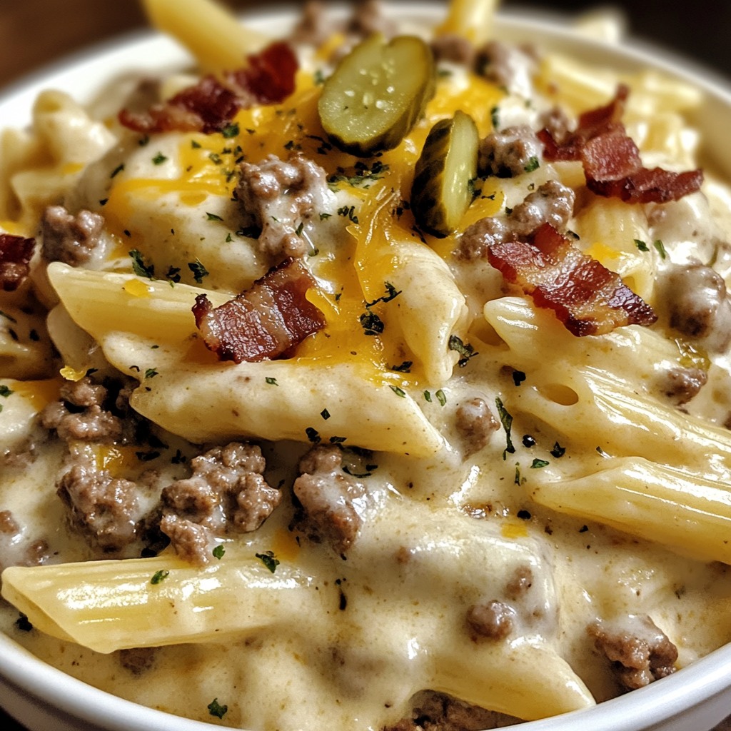 Przygotuj się na idealne połączenie comfort food: kremowy makaron Alfredo z soczystym cheeseburgerem – i oczywiście bekonem.