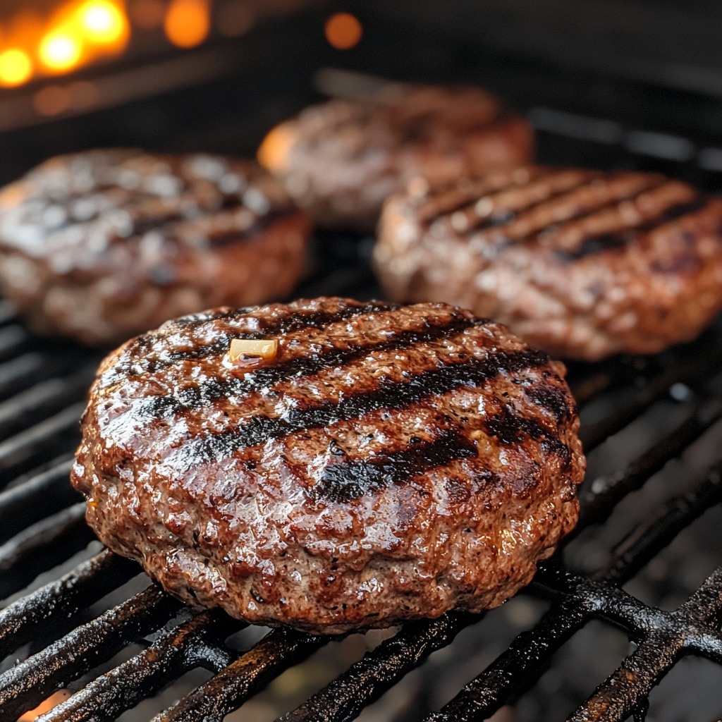 Grube, soczyste burgery grillowane do perfekcji z przypaloną skórką i delikatnym, aromatycznym środkiem — idealny przysmak z grilla na świeżym powietrzu!