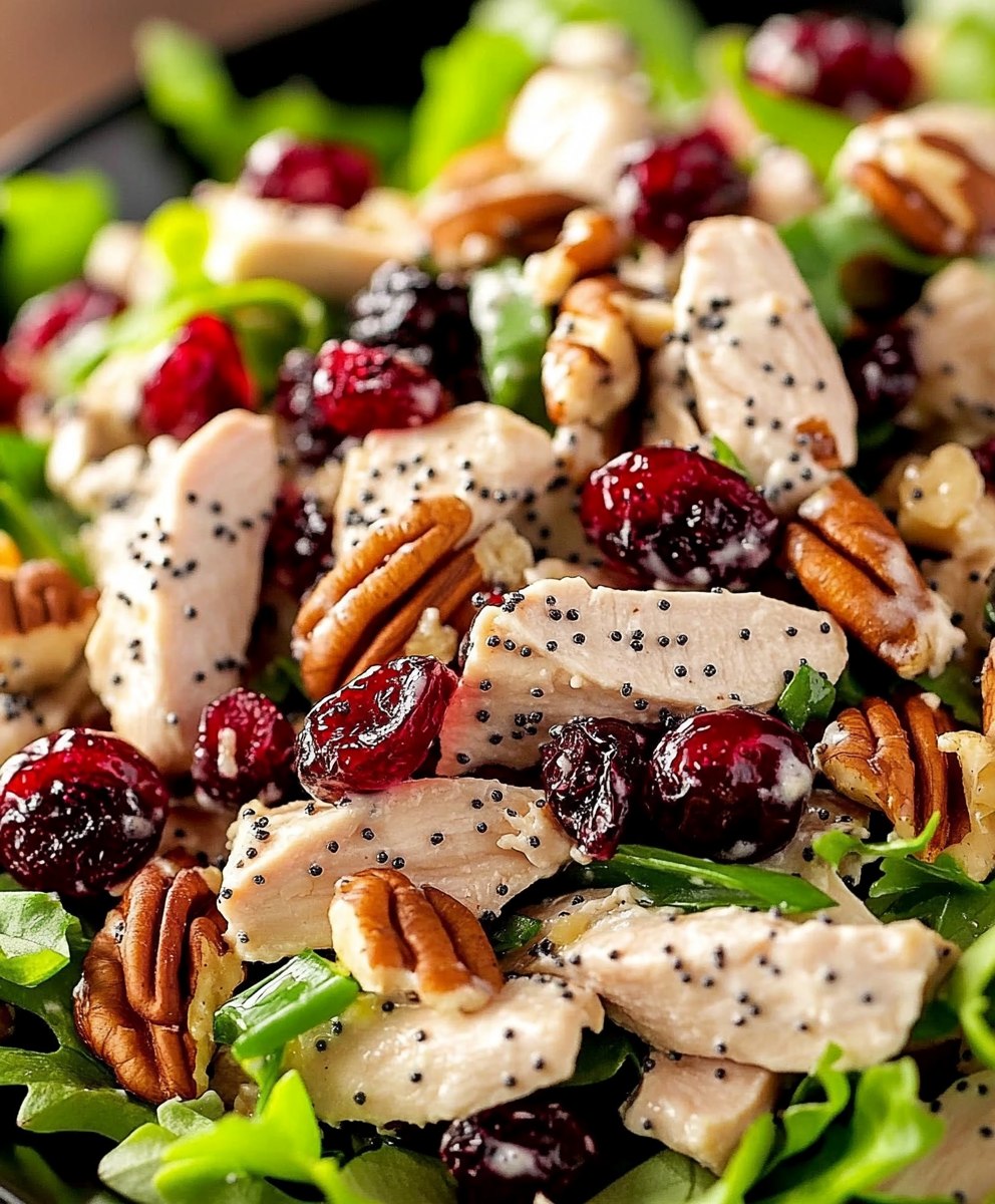 Ta pełna życia sałatka jest pełna słodkiej żurawiny, chrupiących orzechów pekan i soczystego kurczaka – a wszystko to połączone kremowym sosem makowym. Idealna na słoneczne lunche lub lekkie kolacje!