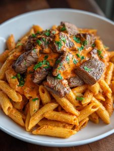 🍝🥩🍅🧄🧀 **Penne ze stekiem i kremowym czerwonym sosem**