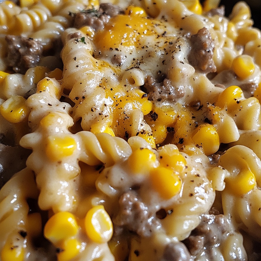 **✨ Kremowe, serowe danie makaronowe z mieloną wołowiną, przyprawą ranch i słodką kukurydzą – bezproblemowo ugotowane w wolnowarze, idealne na pocieszający posiłek!**