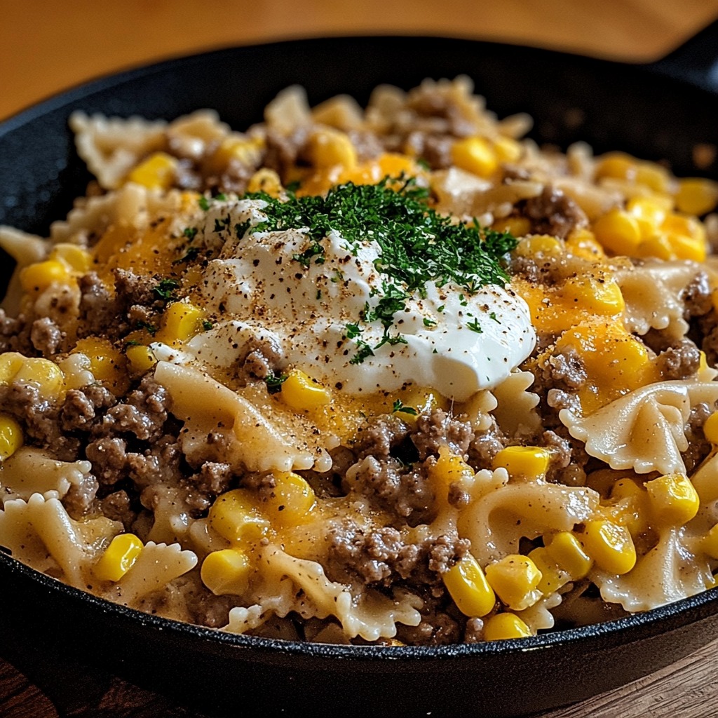 **✨ Kremowe, serowe danie z patelni z mieloną wołowiną, przyprawą ranch, kukurydzą i makaronem muszki — gotowe w mgnieniu oka na pożywny posiłek!**