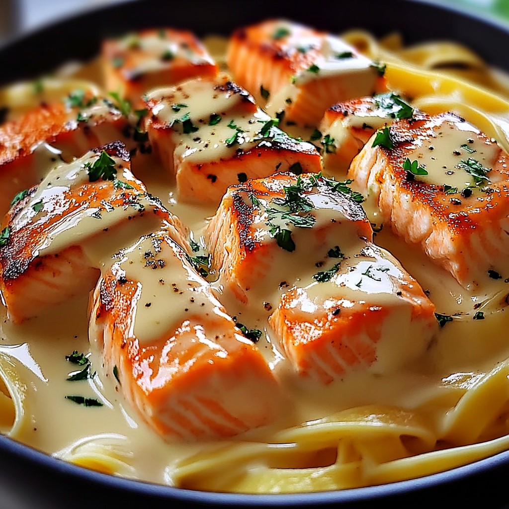 **✨ Aksamitny sos czosnkowo-maślany idealnie otula płatkowego łososia i delikatny makaron – czysta przyjemność w każdym kęsie, gotowy w mniej niż 30 minut!**