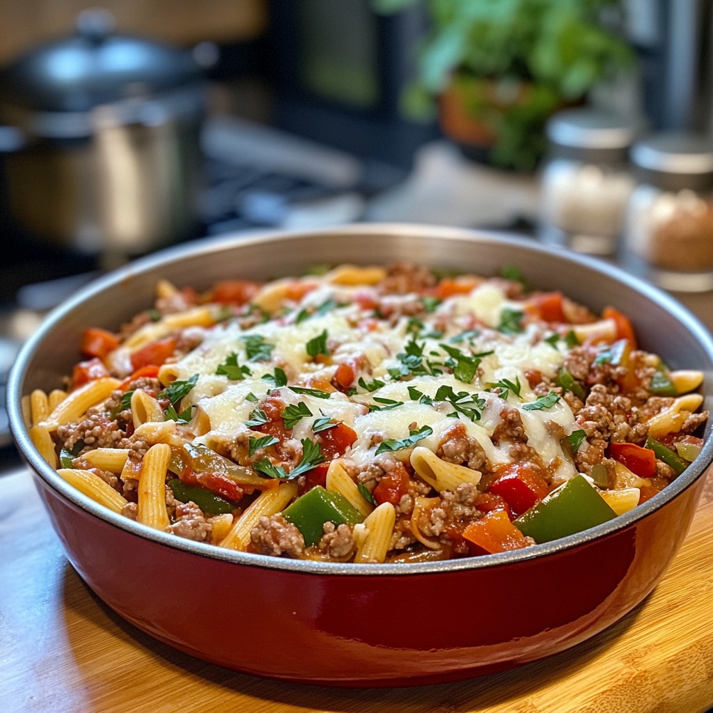**🔥🍝 Pikantny makaron z kiełbasą i papryką na patelni – Cudo z jednej patelni! 🌶️🧀**