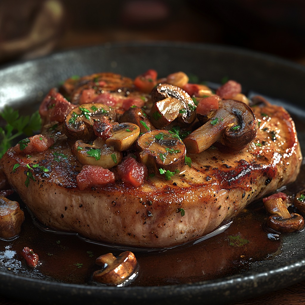 **🔥🥓 Kremowe kotlety wieprzowe z boczkiem i pieczarkami – Czysta pociecha na talerzu! 🍽️🍄**