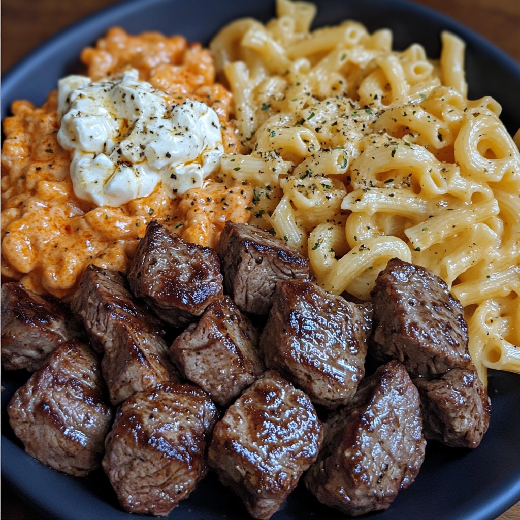 **Delikatne kawałki steku w sosie czosnkowym z wyrazistym, serowym makaronem Buffalo — kremowe, pikantne i idealnie zapieczone!**
