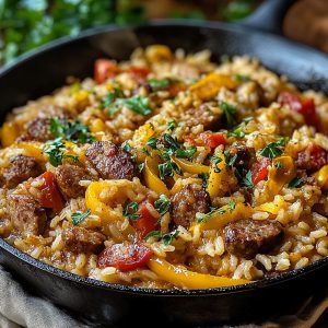 Szukasz szybkiego, aromatycznego obiadu z minimalną ilością sprzątania? Ta kremowa kiełbasa z ryżem na patelni jest pełna soczystej kiełbasy, delikatnego ryżu i wyrazistej papryki — a wszystko to polane serowym, pikantnym sosem, który rozpieszcza każdego kęsa!