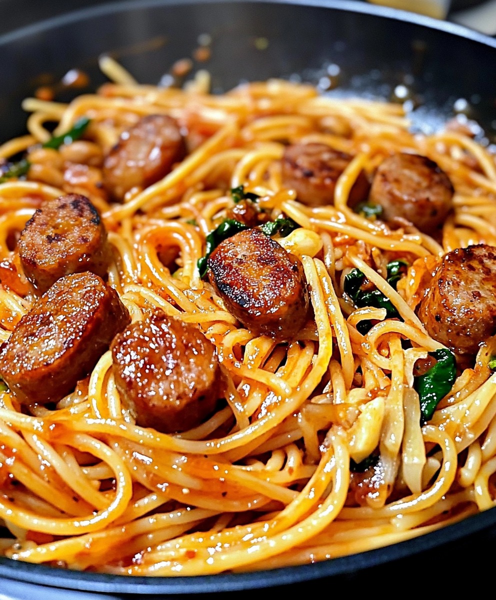 **🔥 Eksplozja lepkiej kiełbasy z miodem i czosnkiem oraz makaronu 🍯🌭**