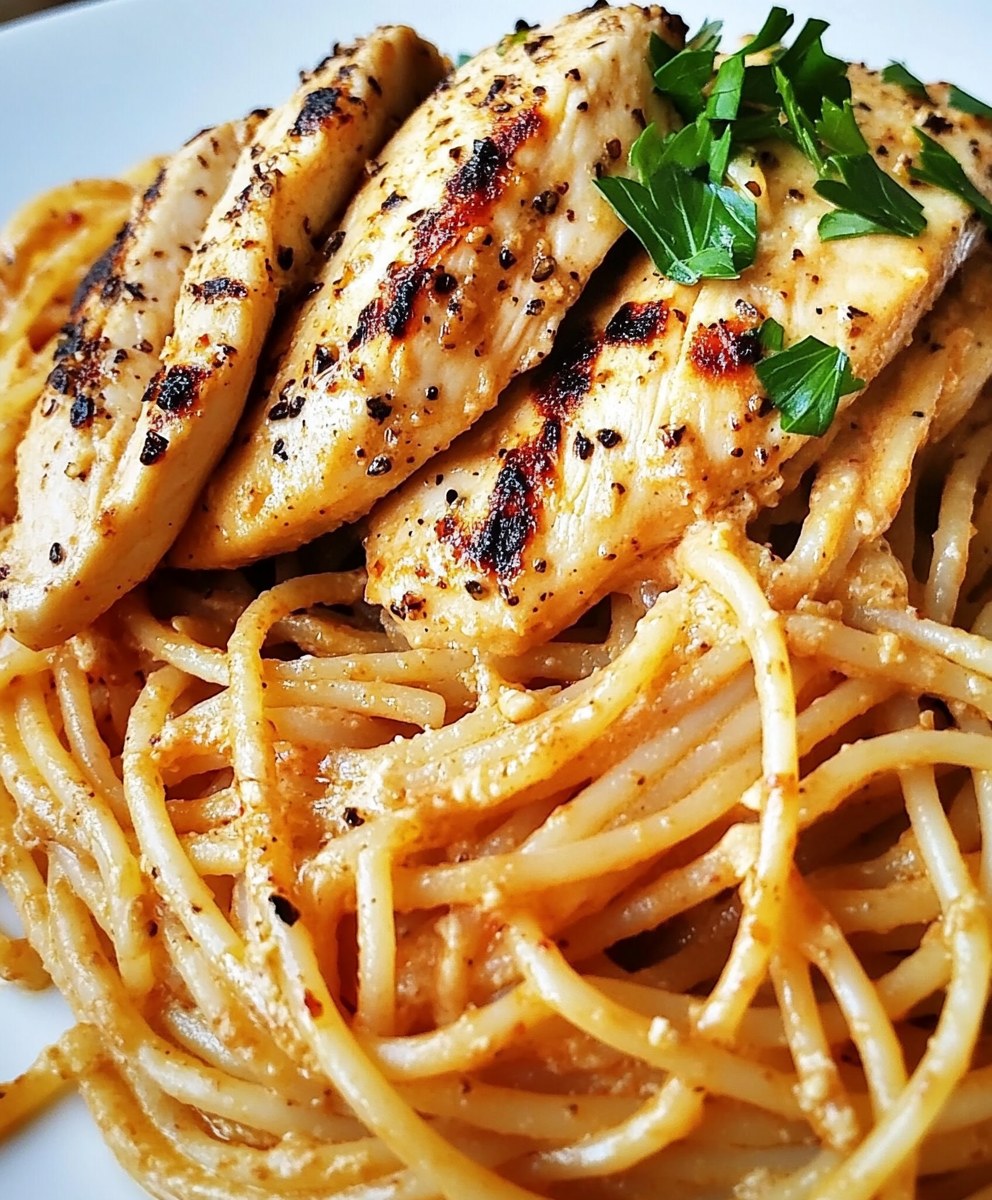 **🔥 Kremowy spaghetti z grillowanym kurczakiem – Klasyk comfort food 🍽️**