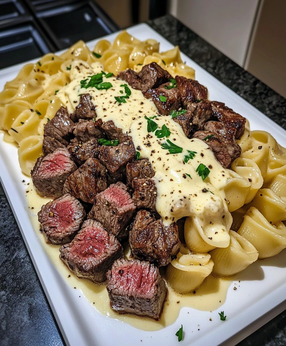 **✨ Delikatne kawałki steka zanurzone w maślanym, czosnkowym sosie, podawane z bogatym, kremowym makaronem w muszelkach parmezanowych – idealna przekąska na wieczór w tygodniu!**