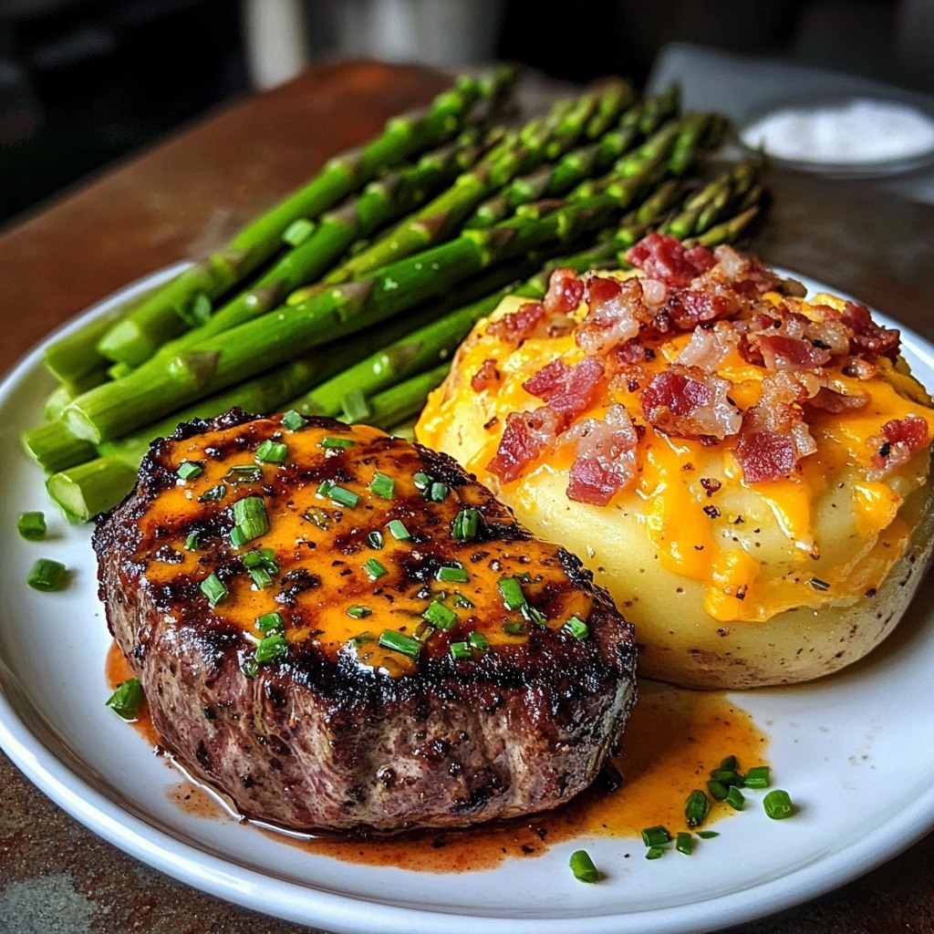 **Obiad ze stekiem godny restauracji, łatwy do przygotowania w domu — bogaty, maślany polędwica wołowa w połączeniu z ziemniakiem i chrupiącymi szparagami z czosnkiem.**