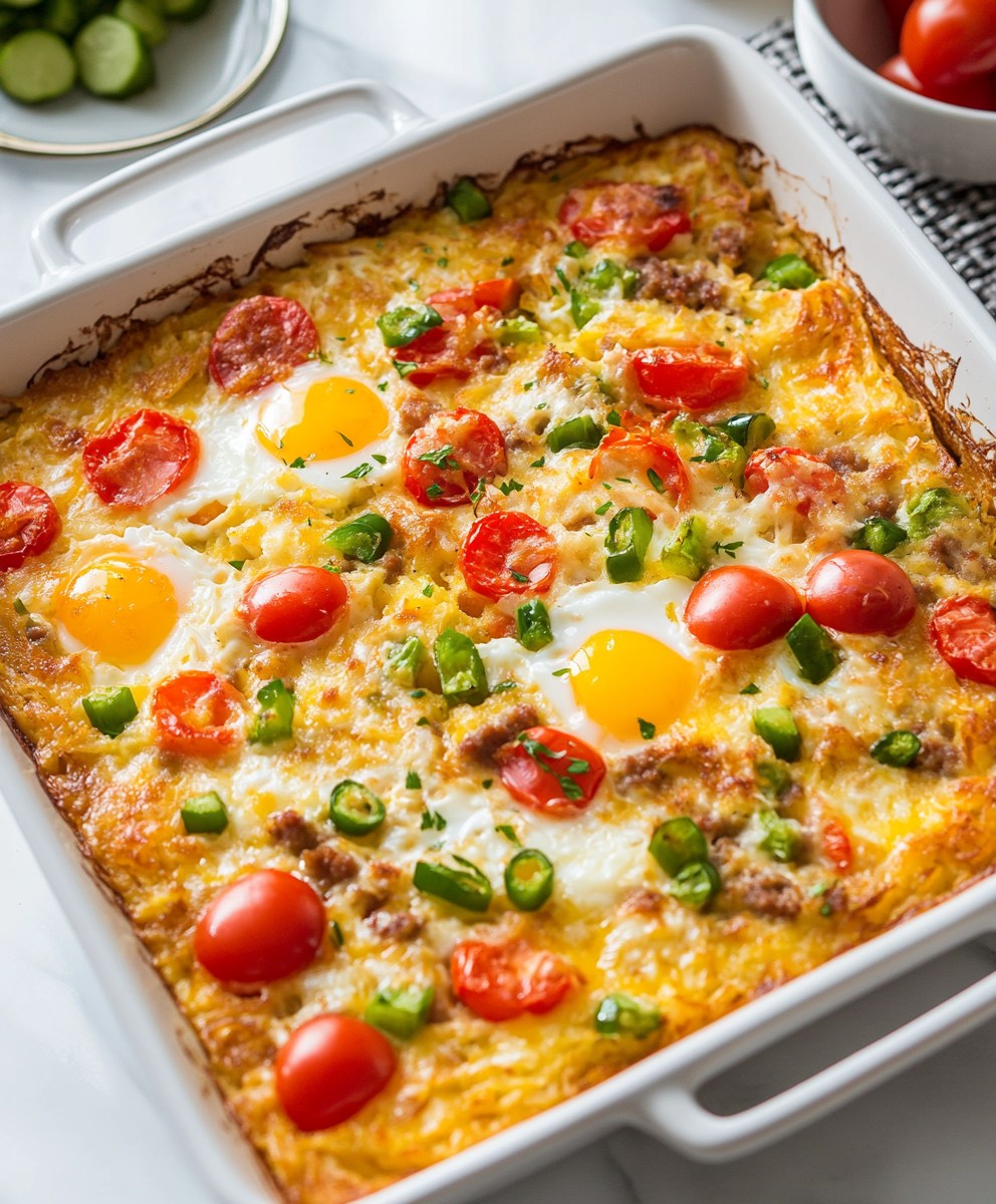Gotowy, by dobrze zacząć dzień? Ta gotowa do przygotowania zapiekanka śniadaniowa jest pełna chrupiących placków ziemniaczanych, serowej pyszności i pikantnej kiełbasy — wszystko w jednym bulgoczącym kęsie!