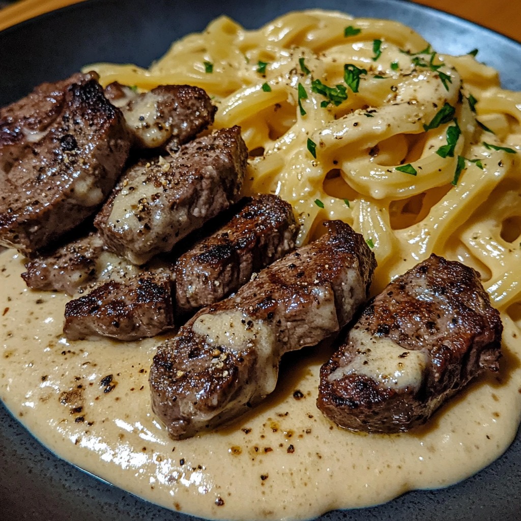 **🥩🔥 Kawałki steku z masłem czosnkowym i pikantny makaron Alfredo z sosem ranch 🌶️🧄**