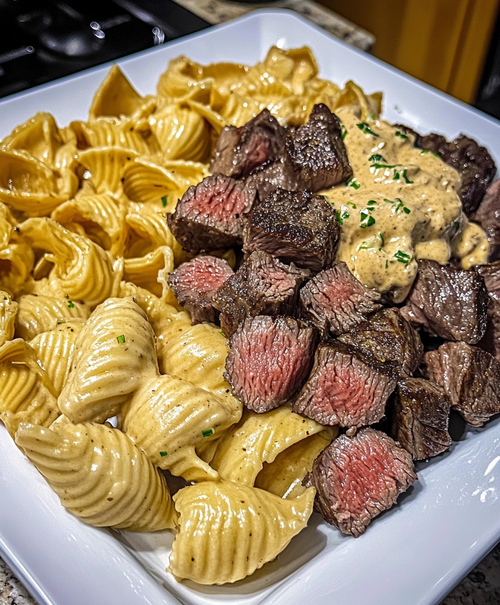 **🔥 Soczyste, delikatne kawałki steku podsmażane na maśle czosnkowym w połączeniu z kremowym makaronem z sosem ranch z pieczoną czerwoną papryką – to idealny duet comfort food na jednym talerzu!**