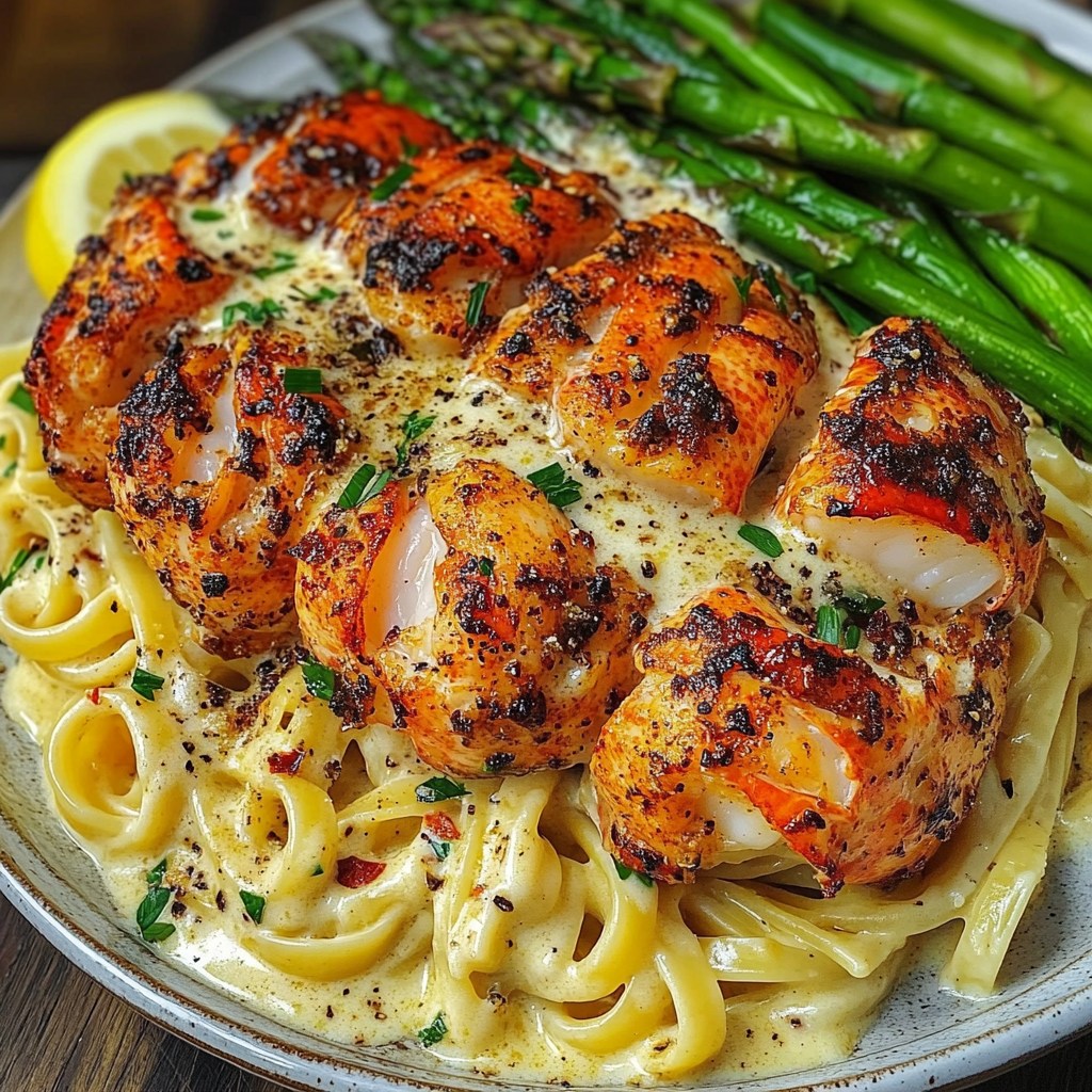 **🦞🌶️ Ogon homara w maśle Cajun z kremowym makaronem czosnkowym i pieczonymi szparagami 🍋🍝**