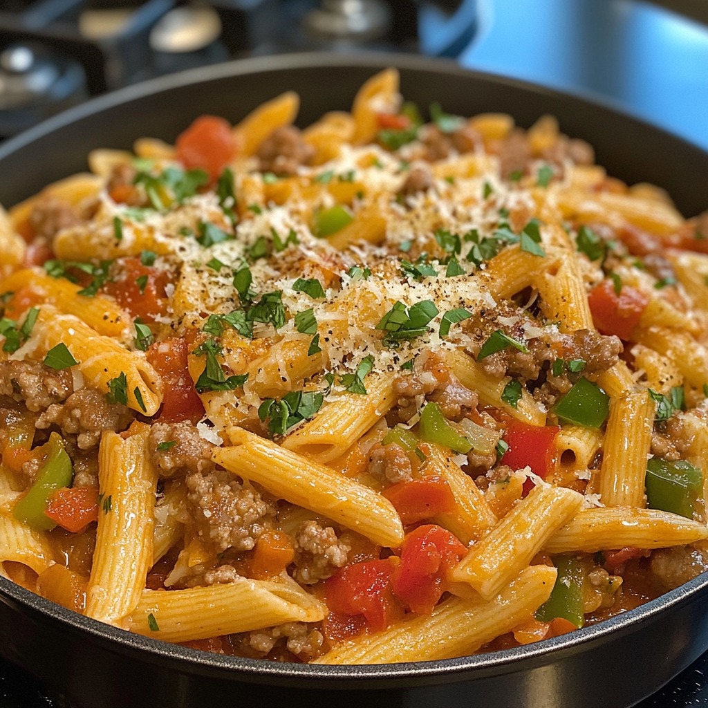 Syty, serowy makaron z patelni pełen pikantnej kiełbasy, słodkiej papryki i wyrazistych przypraw — idealny na zabiegane wieczory!