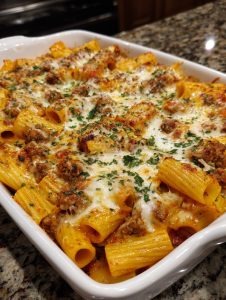 Sycąca, serowa i pieczona w piekarniku do perfekcji – ta pożywna zapiekanka makaronowa jest pełna aromatycznej wołowiny, delikatnych makaronów rigatoni i bogatego, kremowego sosu serowego. Idealna na rodzinne obiady lub posiłki do przygotowania z wyprzedzeniem. 😍🔥