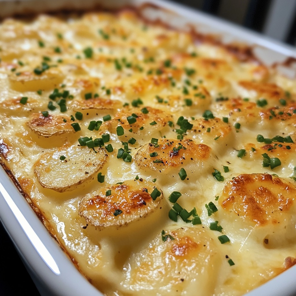 **✨ Warstwy cienko pokrojonych ziemniaków zapiekane w bogatym, kremowym sosie serowym — chrupiące na wierzchu, kremowe w środku i absolutnie nie do odparcia!**