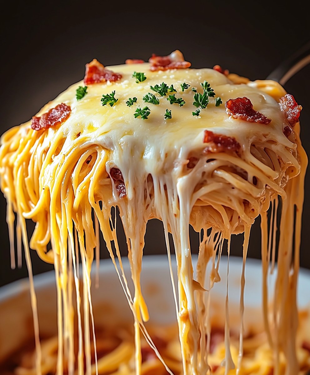 **🧄🥓 Zapiekanka spaghetti z kremowym boczkiem i czosnkiem**