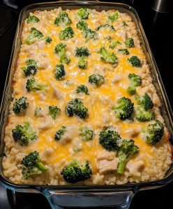 Szukasz przytulnego, serowego i sycącego posiłku? Ta kremowa zapiekanka łączy delikatnego kurczaka, brokuły i ryż w sosie czosnkowo-serowym — magia obiadu na jednej patelni!