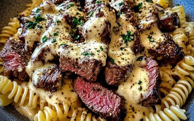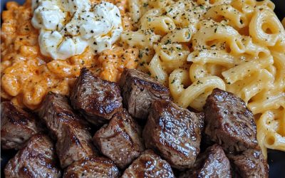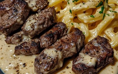 **🥩🔥 Kawałki steku z masłem czosnkowym i pikantny makaron Alfredo z sosem ranch 🌶️🧄** **Soczyste kawałki steku z czosnkiem, idealnie…