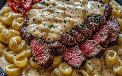 **Maślany stek czosnkowy z kremowym makaronem z czerwoną papryką i sosem ranch 🥩🧄🌶️** 🔥 Masz ochotę na coś pocieszającego z…