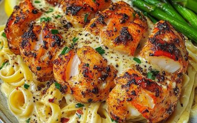 **🦞🌶️ Ogon homara w maśle Cajun z kremowym makaronem czosnkowym i pieczonymi szparagami 🍋🍝** Przygotuj się na wykwintną kolację! Pikantne…