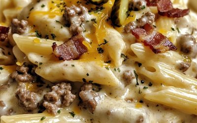 **🍔🧀 Eksplozja makaronu Alfredo z bekonem i cheeseburgerem! 🔥🍝**