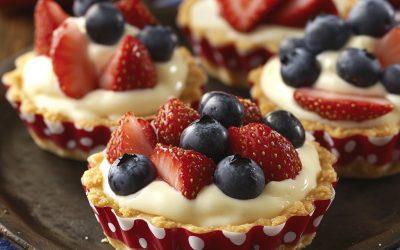 **🇺🇸Czerwono-biało-niebieskie mini tartaletki z kremem jagodowym – świąteczne i eleganckie!🍓🫐🎇** Te delikatne tartaletki łączą maślany spód z kremowym kremem waniliowym…