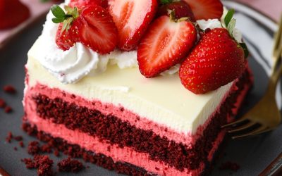 *🍓 Niebiański sernik truskawkowy Red Velvet 🍰❤️** Wymarzone połączenie bogatego ciasta Red Velvet, kremowego sernika i świeżego sosu truskawkowego —…