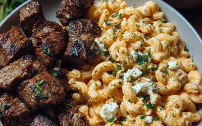 🥩🧄🔥 **Kęski steku z masłem czosnkowym i pikantnym makaronem zapiekanym z serkiem śmietankowym Buffalo** **Składniki:** 🥩 450 g steku z…