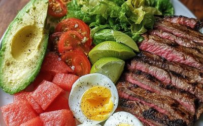 🥩 **Talerz z bogatym w białko stekiem i awokado ze świeżą sałatką i jajkami na twardo**
