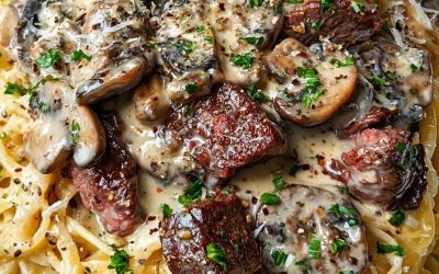 🍝🥩🍄🧄💛 **Kremowe kawałki steku z makaronem linguine z grzybami, ziołami i parmezanem** **Składniki:** 🍝 350 g makaronu linguine 🥩 450…