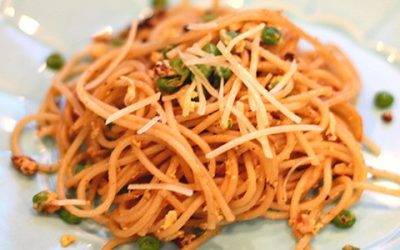 Pełnoziarniste spaghetti z groszkiem i pancettą