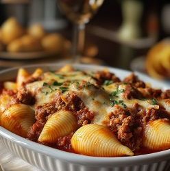 **🍽️✨ Pieczone muszle faszerowane kiełbasą i ricottą – idealne danie pocieszenia!**