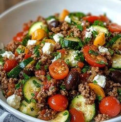 **🍆🔥 Pikantna śródziemnomorska wołowina smażona z kruszonką z fety 🫒🍅** Rozkoszuj się wyrazistymi smakami tego prostego dania śródziemnomorskiego z mieloną…