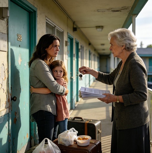 Gdy otworzyłam drzwi, światło z korytarza zalało zrujnowany pokój motelu za mną – cienki dywan poplamiony starymi plamami, migocząca lampa, moja pięcioletnia córka Lily zwinięta na łóżku z papierowym kubkiem pełnym makaronu.