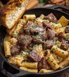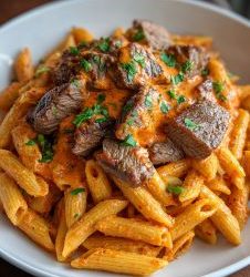 🍝🥩🍅🧄🧀 **Penne ze stekiem i kremowym czerwonym sosem** **Składniki:** • 350 g makaronu penne • 450 g steku (polędwica wołowa…