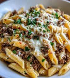 🍝🥩🧀 **Kremowy makaron z wołowiną i mozzarellą** **Składniki:** • 340 g makaronu (penne, rotini lub rigatoni) • 450 g mielonej…