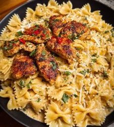 🍝🔥🧄 **Kurczak Cajun z czosnkiem i kremem z trzech serów** **Składniki:** 🍝 425 g makaronu kokardki 🐔 750 g piersi…