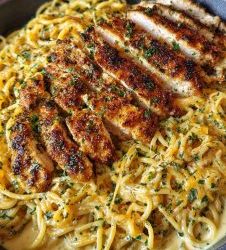 🍝🐔🧄🧀 **Spaghetti z kurczakiem w maśle czosnkowym i sosem Alfredo z cheddarem** **Składniki:** 🍝 540 g spaghetti 🐔 0,75 kg…