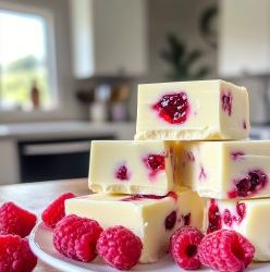 **Kwadraty z białą czekoladą i malinami 🍫🍓** Słodki, kremowy i ozdobiony malinowymi wstążkami, ten fudge bez pieczenia to wymarzony deser…