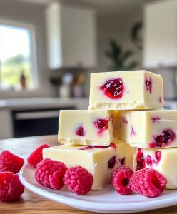 Słodki, kremowy i ozdobiony malinowymi wstążkami, ten fudge bez pieczenia to wymarzony deser na każdą okazję — od świąt po wieczory filmowe!
