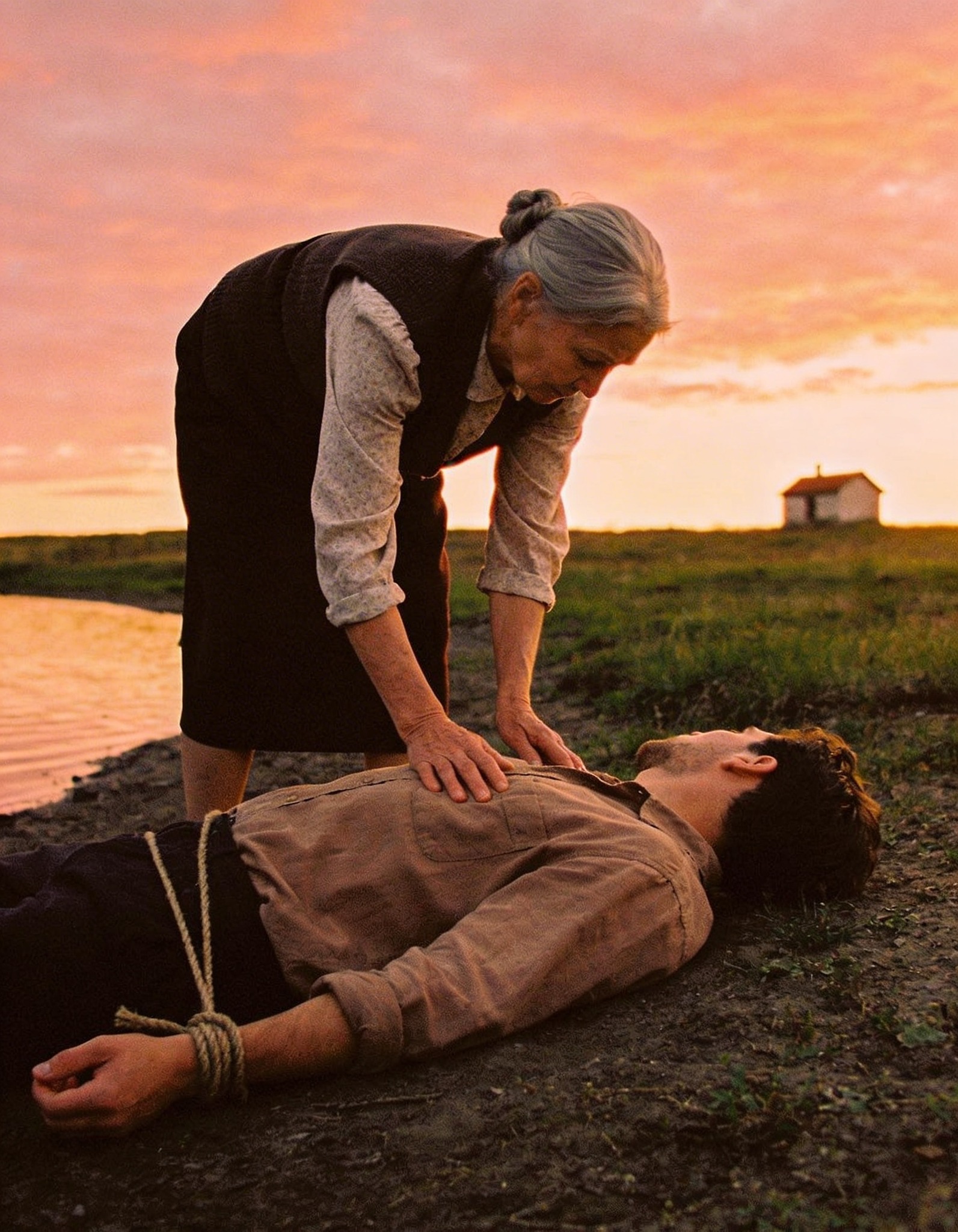 Gdy płomienie zaczęły trawić drewno, a w pokoju zrobiło się gorąco, poczułem, jak mój oddech powraca. Mężczyzna pozostał nieruchomy, z bladą twarzą i ledwo wyczuwalnym oddechem. Usiadłem obok niego, mocno otulając go kocem na piersi. Sięgnąłem do pieca, żeby ogrzać zmarznięte palce.