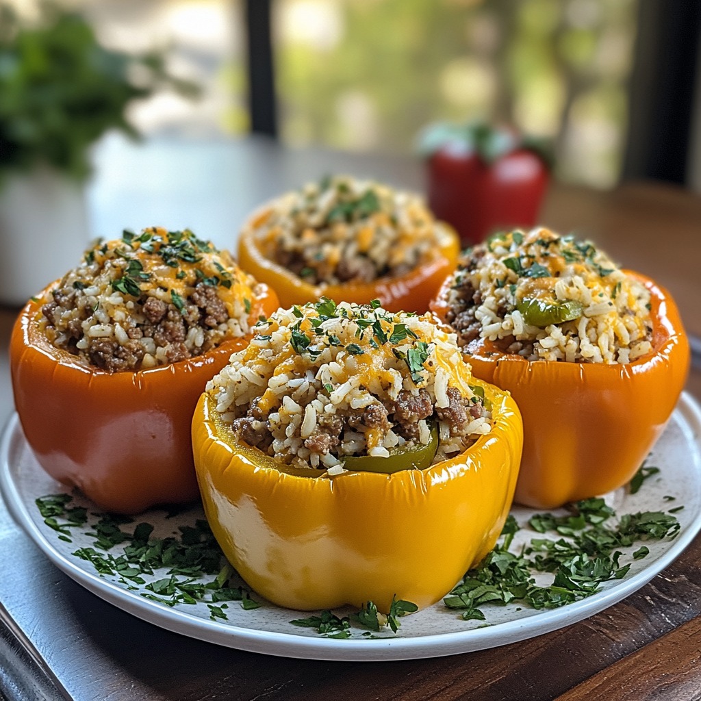 Te kolorowe papryki są pełne aromatycznej mieszanki kiełbasy, ryżu, ziół i roztopionego sera — idealny, sycący obiad!