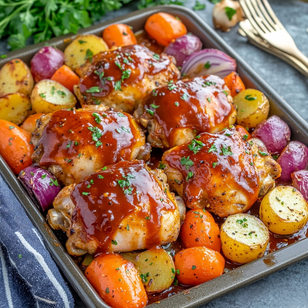 Pyszny, uniwersalny obiad z blachy! Soczyste udka z kurczaka w glazurze BBQ pieczone z kolorowymi warzywami to wyrazisty, 艂atwy i syc膮cy posi艂ek.