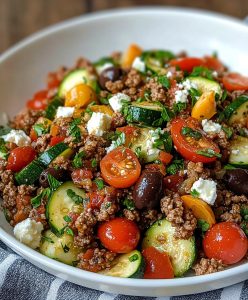 Rozkoszuj się wyrazistymi smakami tego prostego dania śródziemnomorskiego z mieloną wołowiną smażoną – bogatego w warzywa, zioła i nutę magii fety.