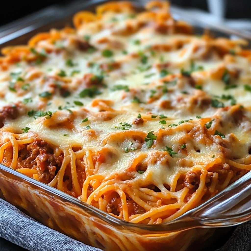 **Bogata, serowa i pożywna zapiekanka spaghetti** z **pikantnym sosem mięsnym, kremowym serem i maślanym makaronem** — prawdziwa **gwiazda**!